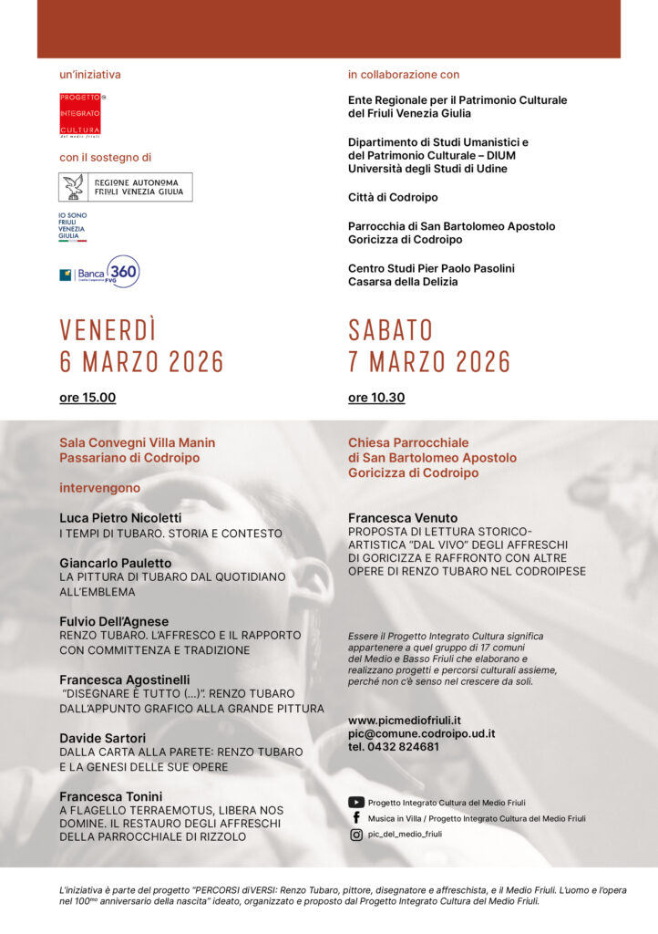 In occasione del centenario dalla nascita in concomitanza con la mostra “Renzo Tubaro Intonare la realtà” sono organizzate due giornate di studi rispettivamente nelle date venerdì 6 marzo presso la sala convegni di Villa Manin a Passariano di Codroipo e sabato 7 marzo presso la Chiesa Parrocchiale di San Bartolomeo Apostolo a Goricizza di Codroipo.