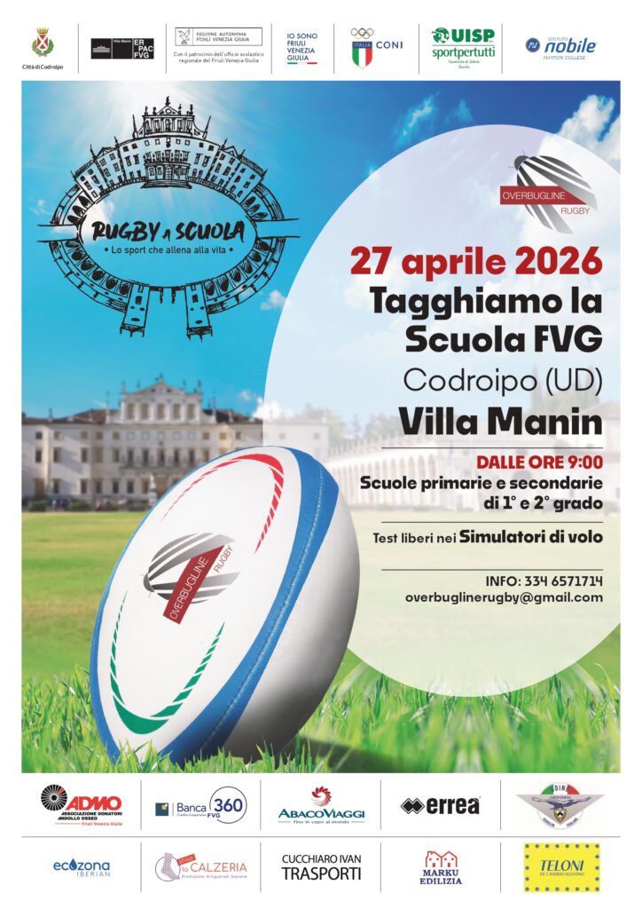 Tagghiamo la Scuola FVG 2026: studenti coinvolti nel rugby TAG a Villa Manin con concorso e attività di volo. PASSARIANO DI CODROIPO (UD) – Torna per l’anno scolastico 2025/2026 l’appuntamento con “Tagghiamo la Scuola FVG”, iniziativa organizzata dall’ASD OVERBUGLINE, affiliata UISP, giunta alla sua quinta edizione. L’evento rappresenta il momento conclusivo di un percorso formativo dedicato alla diffusione del rugby in versione TAG, modalità senza contatto, sviluppato da ottobre ad aprile nelle scuole primarie e secondarie del Friuli Venezia Giulia e del Veneto orientale. Un percorso educativo nelle scuole Il progetto ha coinvolto le classi quarte e quinte delle scuole primarie, le prime, seconde e terze delle secondarie di primo grado e le prime e seconde delle scuole secondarie di secondo grado. Le lezioni di rugby si sono svolte in orario curriculare, coordinate con i referenti per le attività motorie di ogni istituto comprensivo, permettendo agli studenti di familiarizzare con le regole e i valori dello sport in maniera sicura. La giornata finale a Villa Manin L’edizione 2025/2026 si terrà lunedì 27 aprile presso la Piazza Tonda di Villa Manin a Passariano di Codroipo (UD). La manifestazione sportiva, di natura non competitiva, permetterà agli studenti di confrontarsi tra loro e condividere le esperienze maturate durante l’anno scolastico. Come nelle lezioni, anche in questa occasione il gioco sarà nella versione TAG, senza contatto fisico. Gli alunni saranno accompagnati a Villa Manin con pullman, con inizio degli incontri alle 09.00, e rientreranno a scuola entro la fine dell’orario mattutino. Ogni partecipante riceverà una t-shirt celebrativa del TAG Rugby 2025/2026. Scuole coinvolte Rispetto alla precedente edizione, quest’anno parteciperanno le scuole secondarie di secondo grado di Latisana, Lignano Sabbiadoro, Spilimbergo, Codroipo e il Malignani di Udine; le secondarie di primo grado di Basiliano, Sedegliano, Manzano, Corno di Rosazzo, San Giovanni al Natisone, Lignano Sabbiadoro e Latisana; e le scuole primarie di Flaibano, Beivars, Faedis, Attimis, Povoletto e il VI comprensivo di Udine. Partner e contributi Per coprire le spese del trasporto degli studenti dagli istituti a Villa Manin e ritorno sarà richiesto un contributo alla Regione FVG. Importante la collaborazione di partner come l’Istituto Aeronautico Nobile di Fagagna, che metterà a disposizione due simulatori di volo, oltre a E.R.P.A.C., Banca TER, Abaco Viaggi, A.D.M.O., Drone Rep, Ecozona Iberian e l’Aeroclub di Campoformido. Concorso e iniziative extra sportive Durante l’evento si terrà anche un concorso artistico: ogni classe realizzerà un disegno su cartoncino 70×100 con tema “Rugby e il volo in ogni sua forma”, esposto in Villa Manin. I vincitori, due per ciascun livello scolastico, saranno premiati con esperienze legate al volo: un ragazzo o una ragazza effettuerà un volo in aereo presso l’Aeroclub Friulano di Campoformido, e un altro parteciperà a una lezione su simulatore di volo presso l’Istituto Nobile di Fagagna. In caso di condizioni favorevoli, gli studenti potranno osservare anche le Frecce Tricolori sorvolare il cielo di Codroipo.